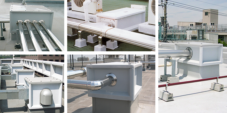 これらの配管類は屋内のパイプシャフトを通り屋上へ取り出されますが、ハト小屋から配管類を取り出すことで、直接防水層を貫通することなく、水平に配管類を取り出すことができ、適切な雨仕舞いを行うことができます。